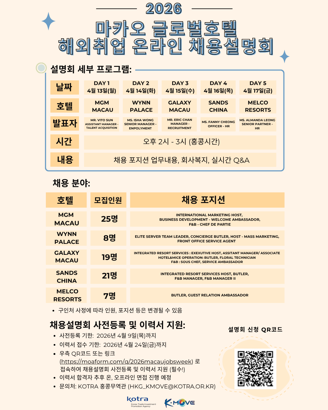 [KOTRA 홍콩무역관] 해외취업지원사업 "2026 마카오 글로벌호텔 취업 온라인 채용설명회"